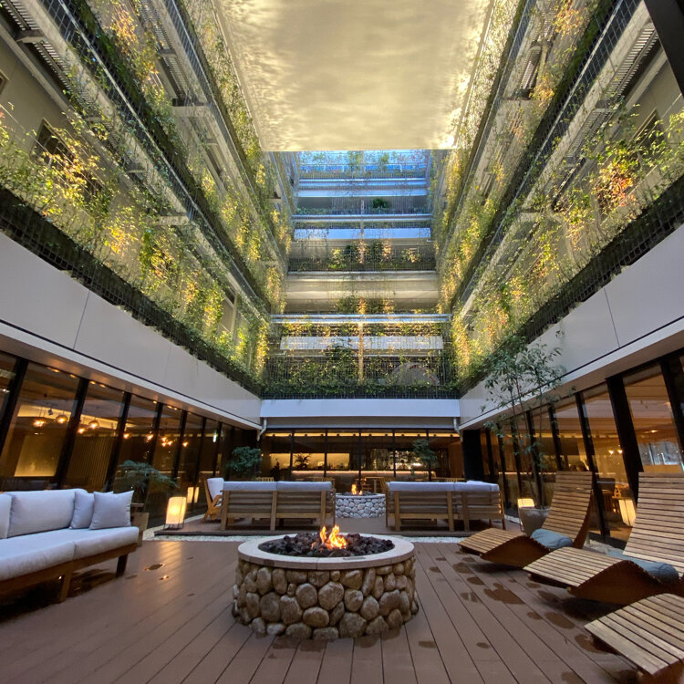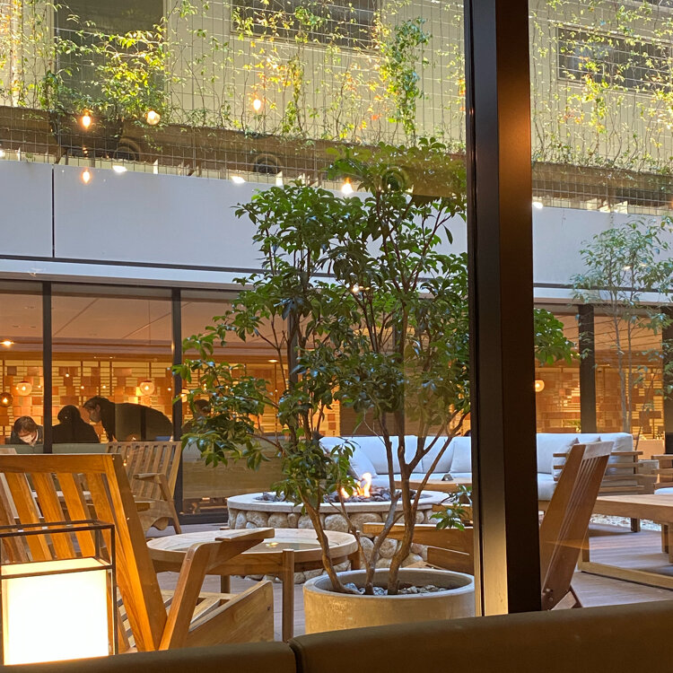暖炉のある広い吹き抜けの素敵なテラス席があって❤️🔥