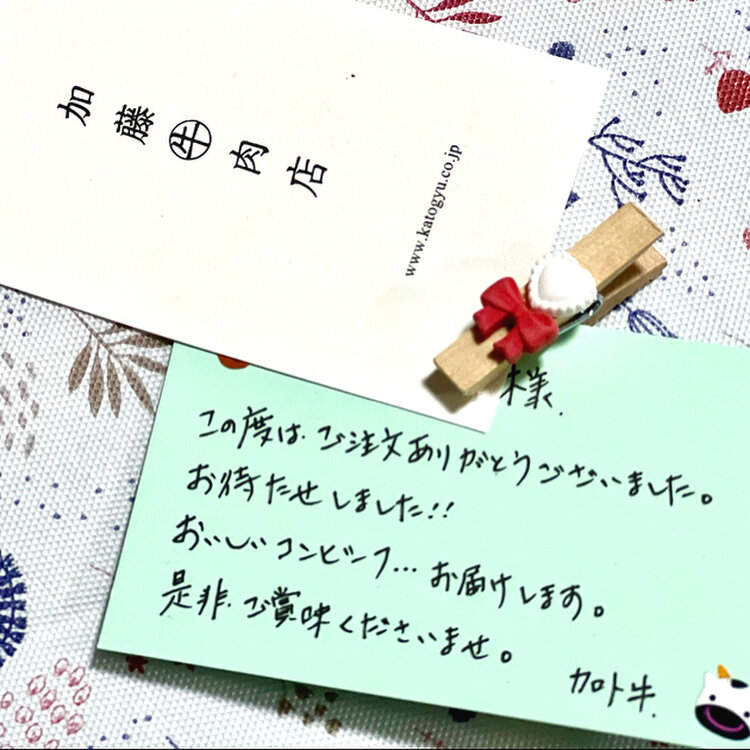 届いたコンビーフには手書きのカードが添えられていてお店の丁寧さが伝わってきました😊