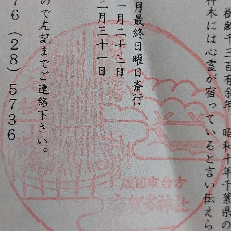 ご自由にどうぞという神社由来の紙があったので、貰ってきたら、そこにかわいらしい神社のスタンプが押してありました🎵