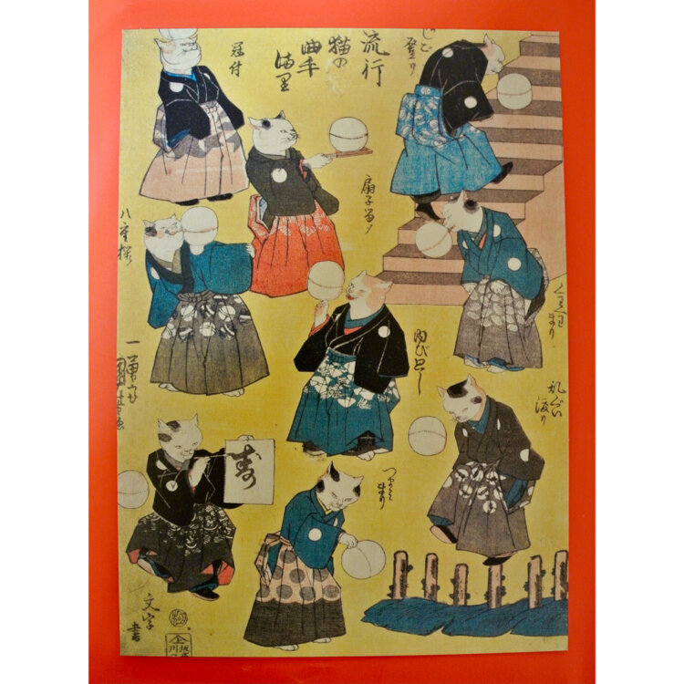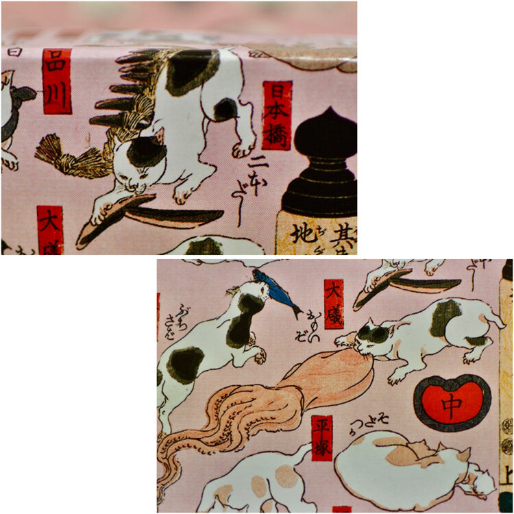国芳の猫浮世絵はピンクを背景に53パターンのねこが描かれています。