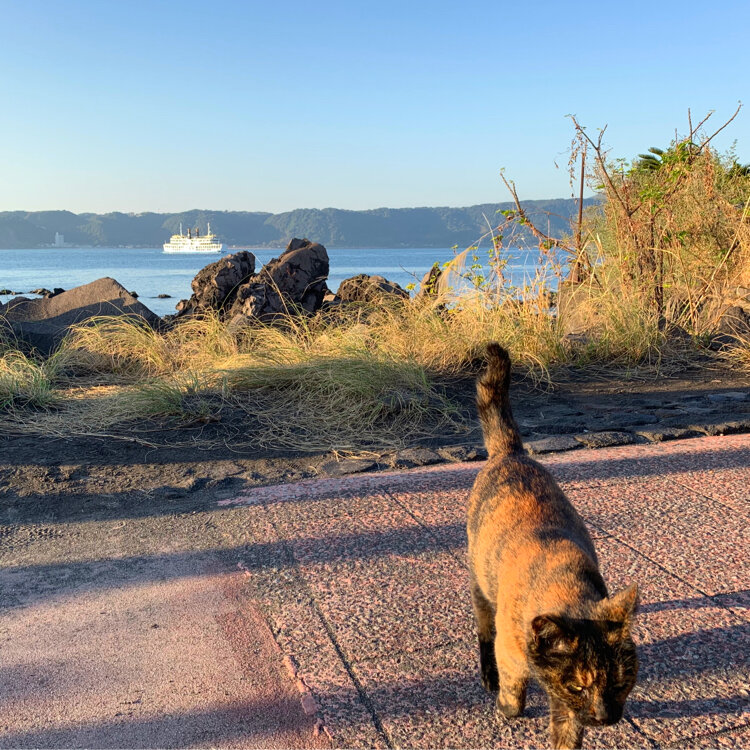 桜島フェリーが行き交う錦江湾をバックに穏やかなひととき。夕陽に照らされて毛並みは艶めき、ちょっと鋭い目つきもなんだかかわいい。