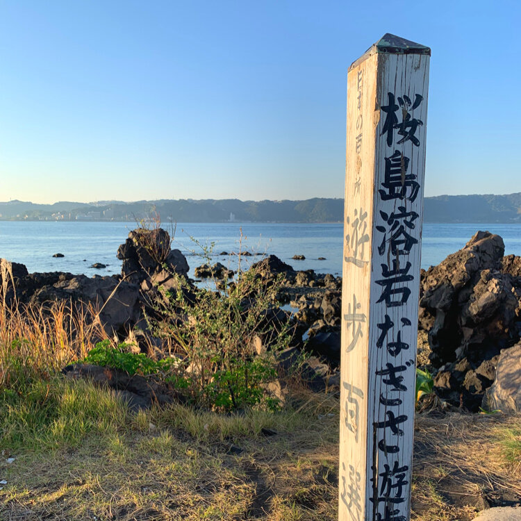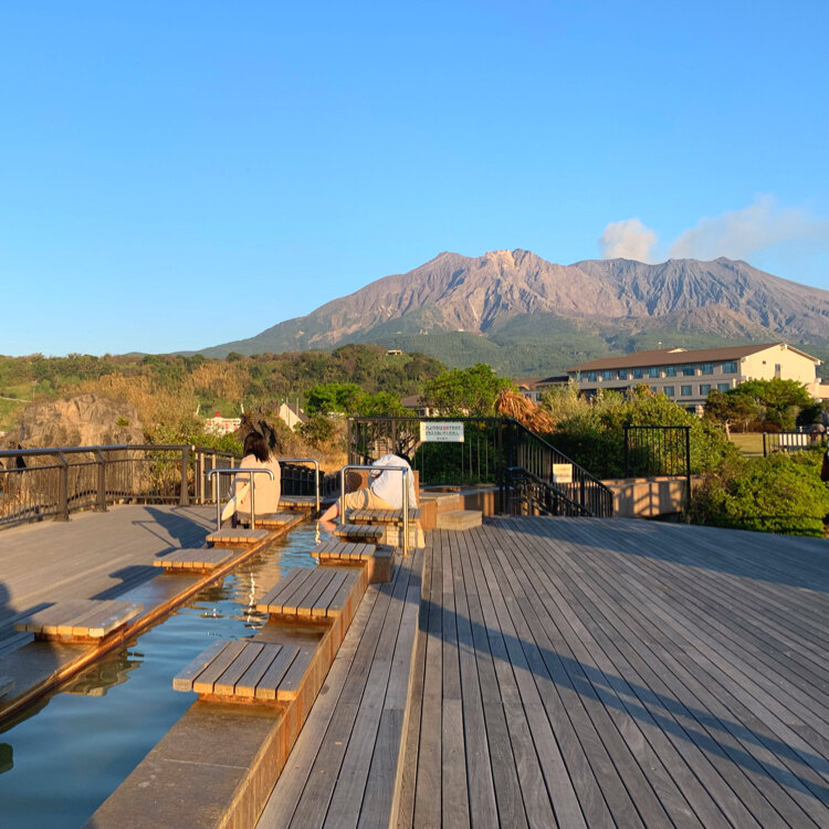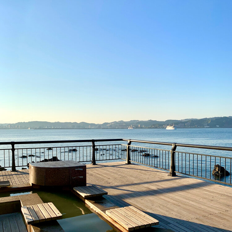 遊歩道と長い長い足湯が整備されています。錦江湾と噴煙をあげる桜島に挟まれて、自然の恵みを感じながらのんびりできるスポットです。足湯に浸りながら海を眺めるひとときもまた格別でした。