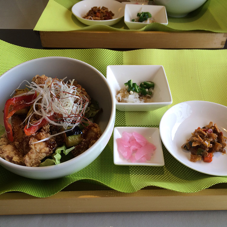 鶏甘辛丼。 ご飯の上にレタス。 その上はサクサクの唐揚げに 茄子、パプリカ、白髪葱‥ 甘めタレがかかって絶妙に旨い。 #ランチ