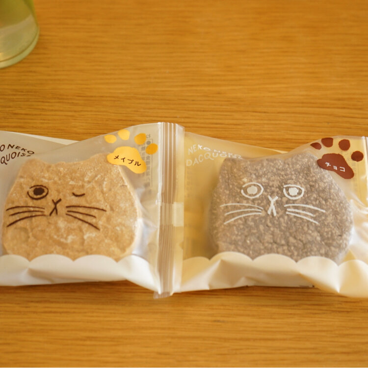 ねこ型のダックワーズ、袋にプリントされたお顔がなんとも言えない癒し系。