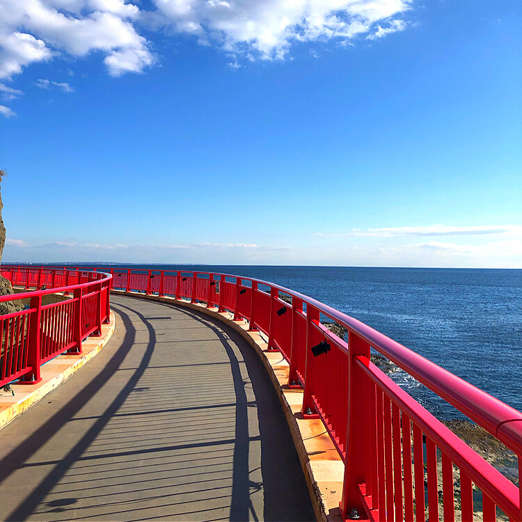 カーブを描く 赤い橋は、青い海に 映えて とても美しい✨