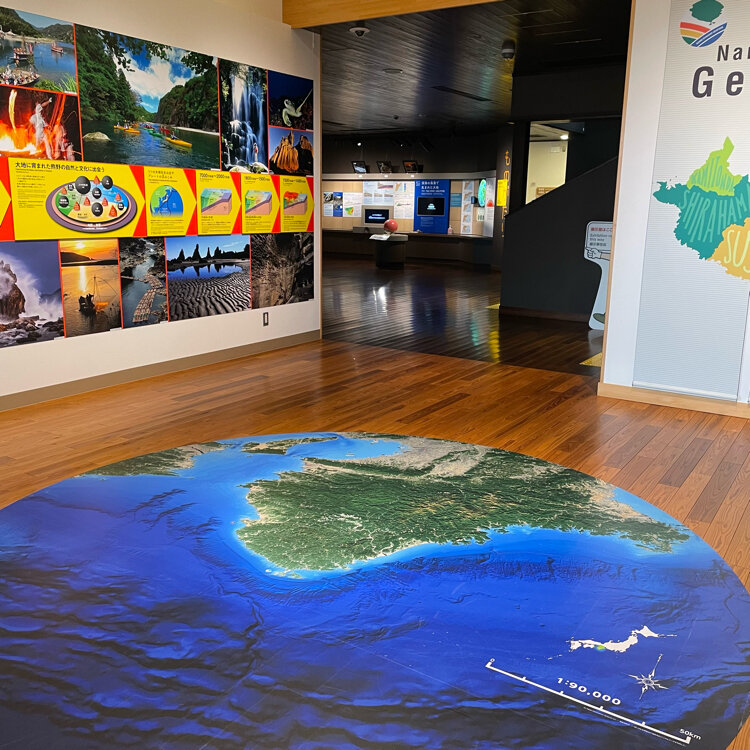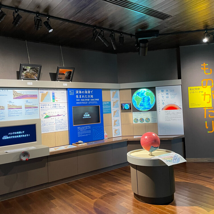 令和元年7月にオープンした新しい施設で、1階には、最新の大型地形模型とプロジェクションマッピングによる映像や実験、体験装置で熊野の大地の成り立ちや自然、生き物などを紹介する展示室や実習室、2階には、大地のドラマを上映する映像室のほか、セミナー室、会議室が有ります。