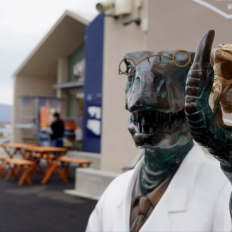 正面には恐竜博士とツーショットが撮れるベンチと絶妙に傾いたフォトスポットがありました。