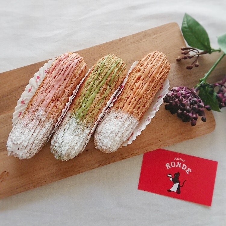 こちらのお店はエクレアも人気とのことで種類の違うエクレアを買ってみました。左からフレーズ、抹茶、キャラメルです。