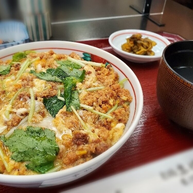 こちらは鶏肉ではなく、そぼろ状の鶏肉と卵で頂く親子丼。少し甘めの味付けで江戸の歴史を舌で感じることができました。汁物とお新香も絶妙です。