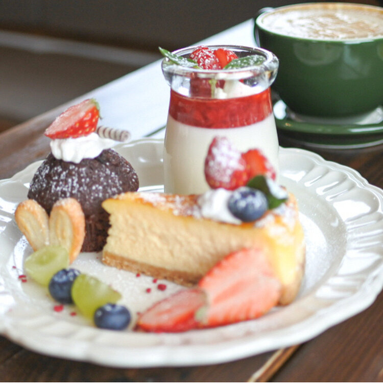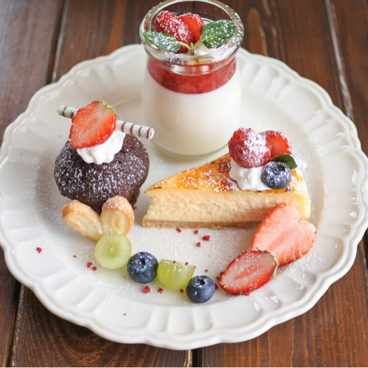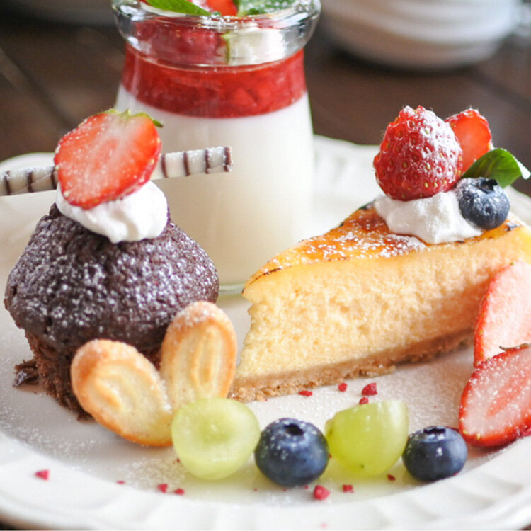 ブリュレチーズケーキ、いちごの杏仁豆腐🍓、チョコカップケーキ、フルーツにハートのパイ。