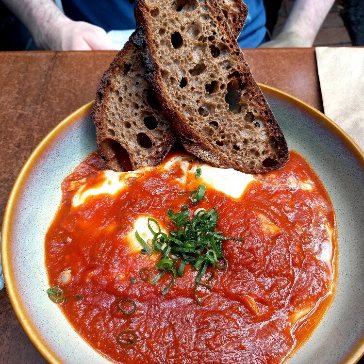 お店のシグニチャーディッシュ、トマトソースに半熟卵とパンも(煉獄のたまご?!)…