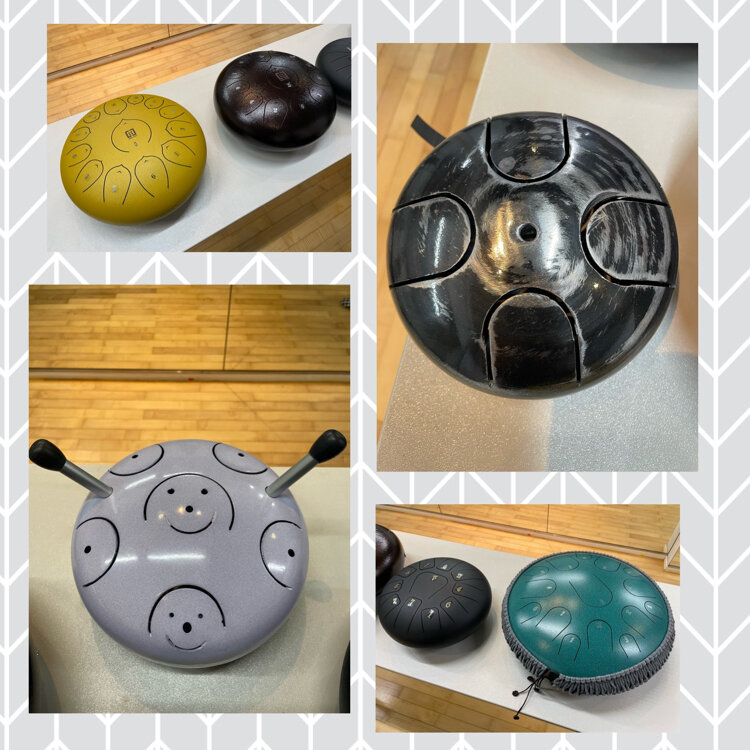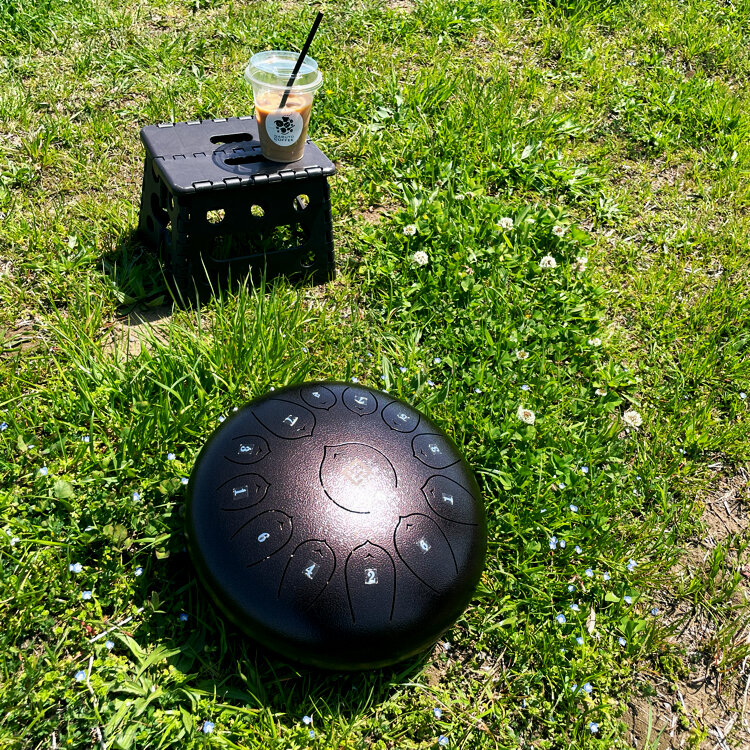 まずは多摩川の土手に行く前に美味しい珈琲を買っていただき、土手に着いたらタングドラムの説明や自己紹介などして早速先生が『My Favorite Things』と『糸』を手で軽やかに叩きながら演奏してくれて、青空の下でとても気持ちがいい〜。瞑想やヨガにも使うシンギングボールの音色が私は好きで、なんとなく仲間のような音色🎶