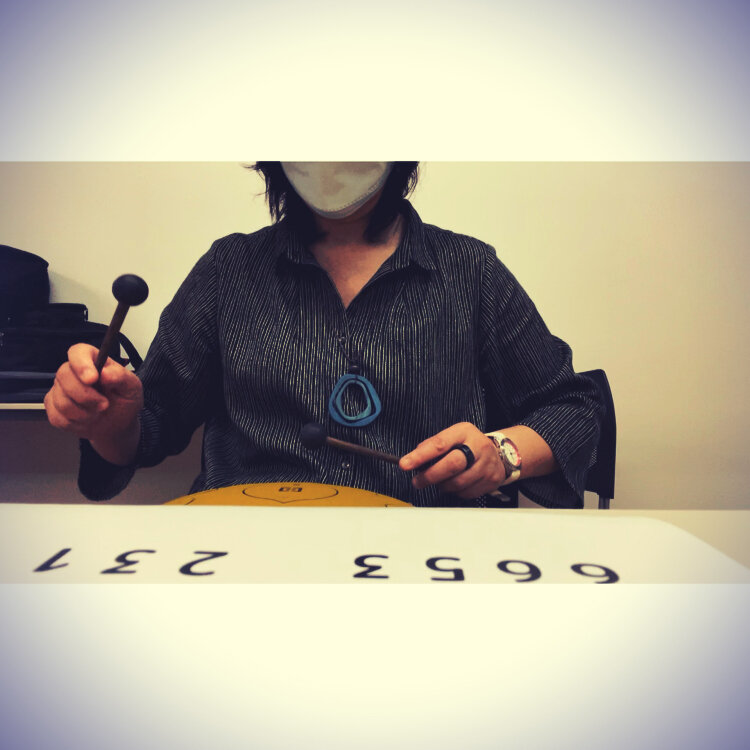 手で叩くのは指先にかなり力がいるようで、参加者はバチを借りて、4枚目の写真のように膝の上にタングドラムを置いて叩きました。