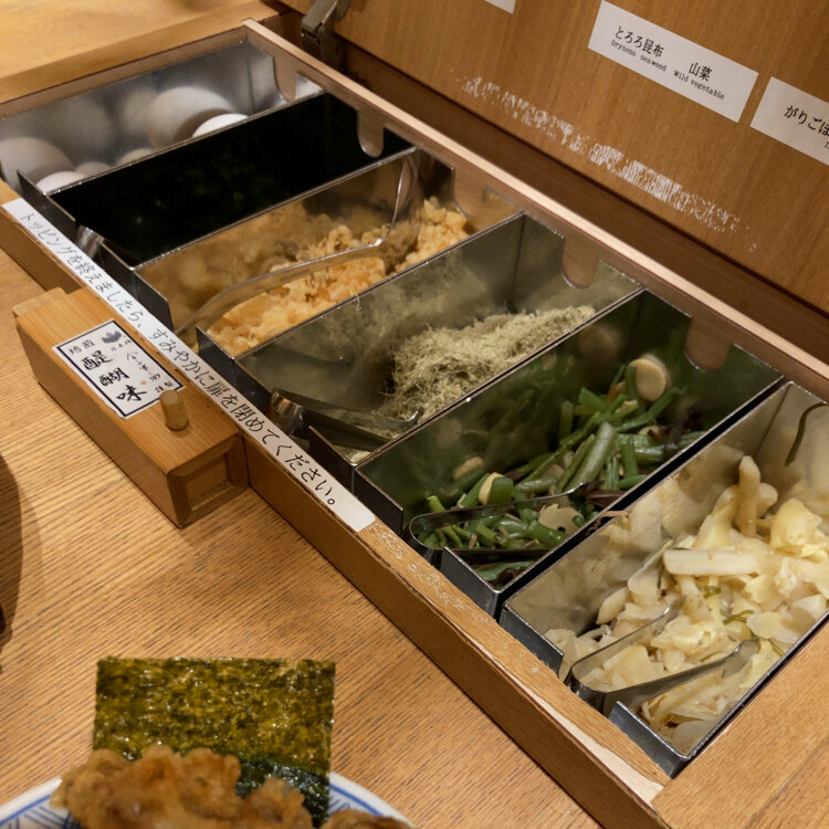 とろろ昆布、山菜、ガリごぼう、温玉、天かす、わかめ。