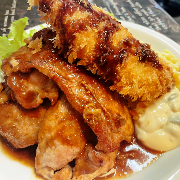 写真がないのでどんなものかわからず『本日のスペシャルランチ白身魚のフライと豚の生姜焼き』850円を頼んだら、すごい盛り盛りのがやってきて一瞬たじろぎました〜🤣