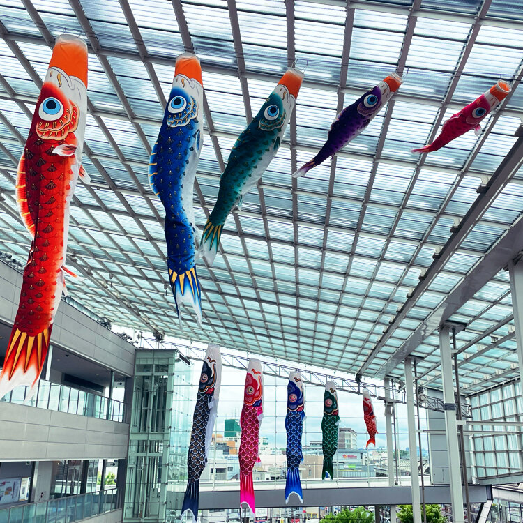あまりにお腹いっぱいなので、駅近くの商業施設のベンチで鯉のぼりを眺めて休憩してから午後の仕事に戻ります〜😆