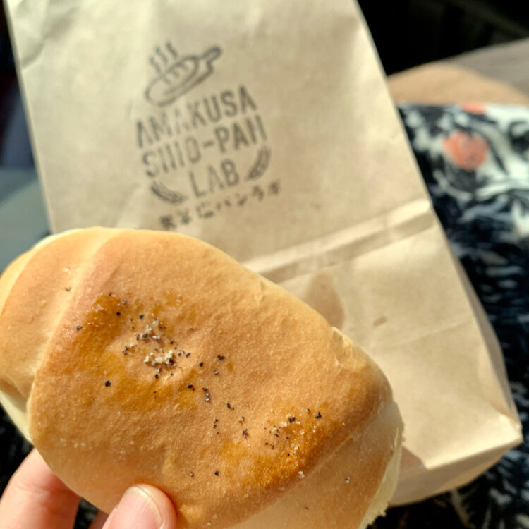 私たちもその焼き立てのいい匂いにつられていくつか塩パンを購入しました。せっかくなので、焼き立てを車の中で。バターたっぷりのリッチな塩パンでとてもおいしかったです。1個じゃ物足りないくらいの危険な味でもあります。
