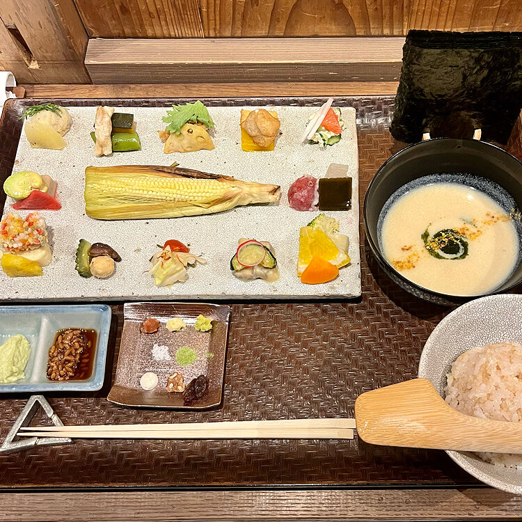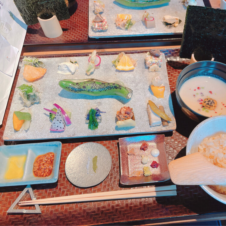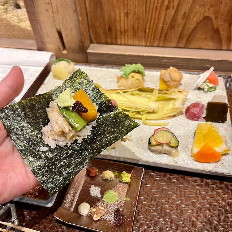 AWOMB 西木屋町さん✨ ずっと興味のあったお店です! お店に寄ってコンセプトが少し違うのでしょうか〜? こちらは京都のものを使った精進料理のようでした!自分で好みの手巻き寿司をつくって楽しんで食べました! たまねぎの汁物が味にインパクトがあり気に入りました😊 他にもに気になるお店がたくさん今日はみつ借りました! 唯一、お休みらしい一日です…笑 満喫できました!