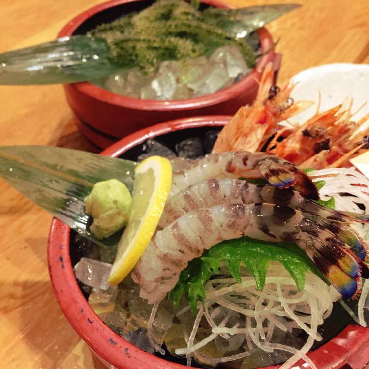 海ぶどうと車海老のお刺身🤗 三線の演奏を聴きながらの沖縄料理♪ 料理は美味しいし三線ライブは楽しいし テンションあがりっぱなし♡ 沖縄をすーぱー満喫*\(^o^)/*