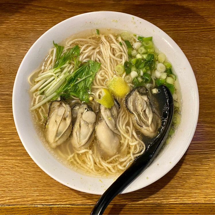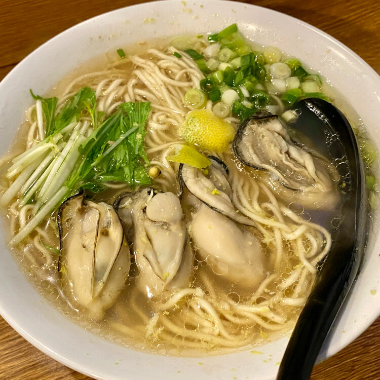 中華そば専門店の『丸忠商店』。 福山の天満屋の裏手にあり、駅からも歩いて5分ほど。 瀬戸の海老で出汁をとってるお店です。 季節限定の牡蠣塩ラーメン。 しまなみの岩城島産ライムが散りばめられていて、爽やかで美味しい✨