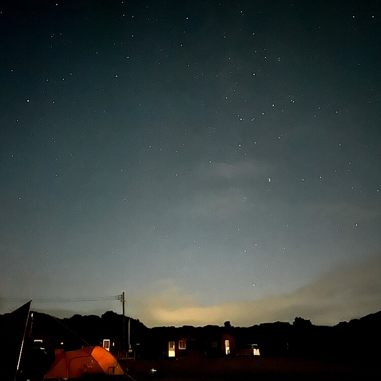 到着した時は曇り空で雨がポツポツ降ったりやんだり。強風でテントを張るのもやっとのことでした💦でも夜中3時頃、目が覚めて外に出ると雲は流れて星空が✨✨