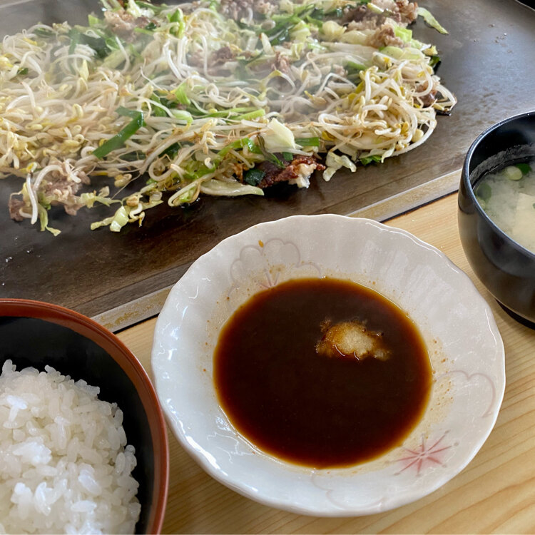モヤシ、ニラ、キャベツなどと一緒に炒められたお肉がお鍋に入れられて運ばれてきて、
