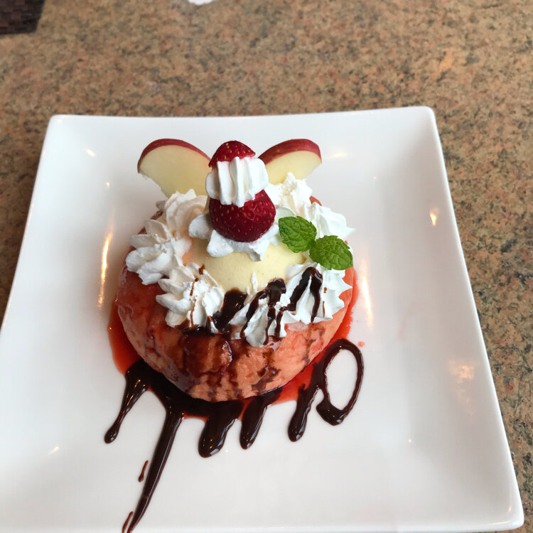 パンケーキではなく丸パンをくり抜いて中にはバニラアイスとりんごのコンポートらしきものが入っていて、パンが温かいのでナイフを入れると中からとろっととけたアイスとりんごが出てきて、じゅわっとソースの染みたパンはとっても美味しいです。