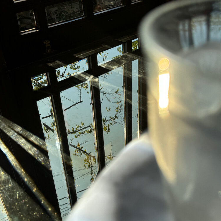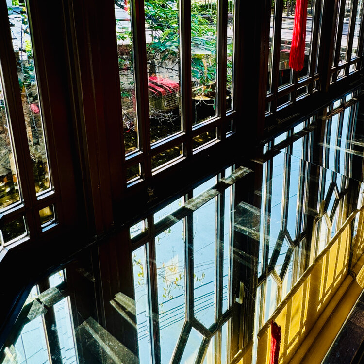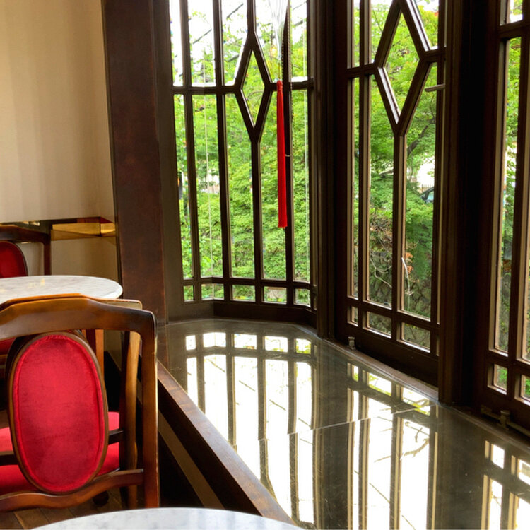 高瀬川は見えませんでしたが鏡張の窓台に映るグリーンが素敵🍃