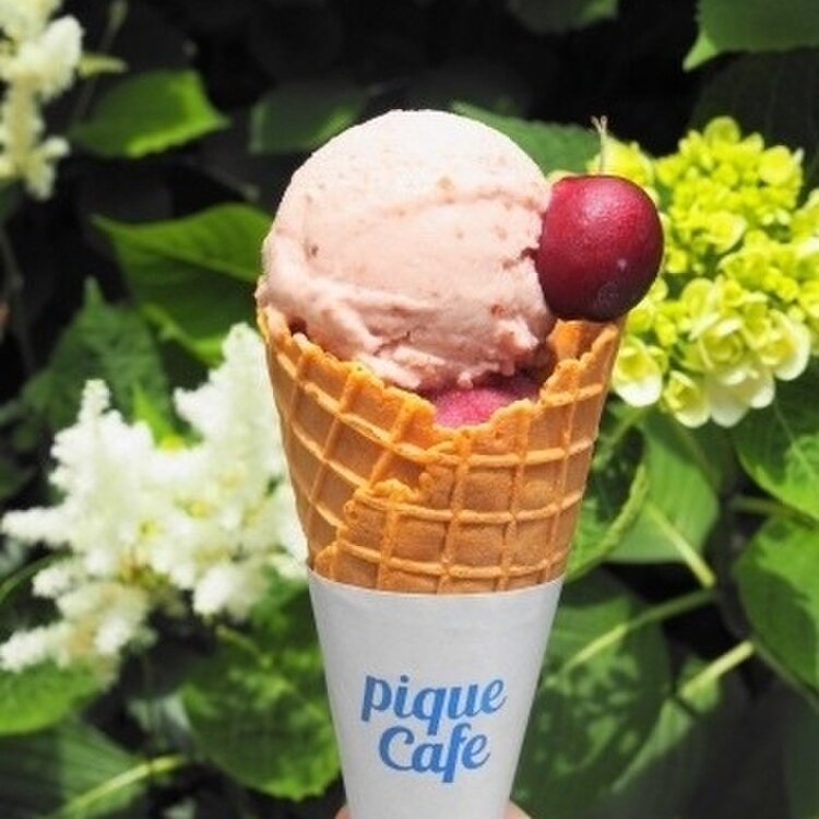【 gelato pique cafe creperie 】 可愛くて、ふわふわの肌触りが気持ちいいルームウェアの「ジェラート ピケ」のカフェ。 三井アウトレットパーク仙台港にできました。 本格フレンチクレープのあまーい香りします。 「アメリカンチェリージェラート&シャーベット」を食べました。 さくらんぼの季節ですもの💕
