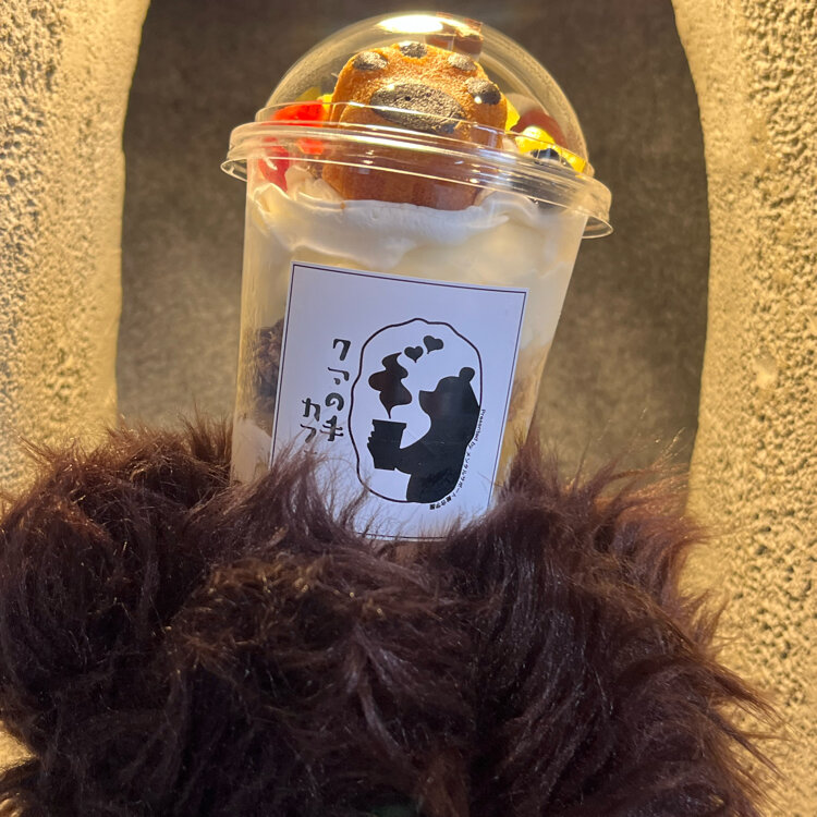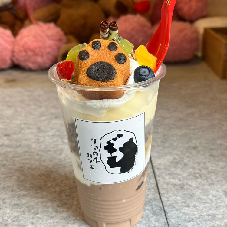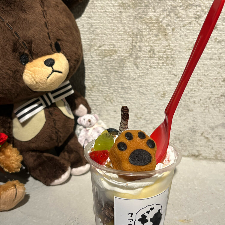 以前ローカルTVでよく特集されいたので一度は行ってみたいと思っていたカフェ。クマをテーマにしたメニューがみんな可愛く、クマさんの手から手渡しされるので可愛いさと映えでいつも並ぶイメージでしたが生憎の天気で計らずも並ばずラッキー(^^) クマグッズが飾られている隣のイートインスペースでゆっくりとパフェを食べれました