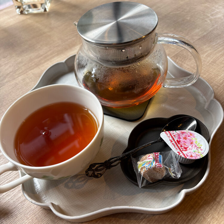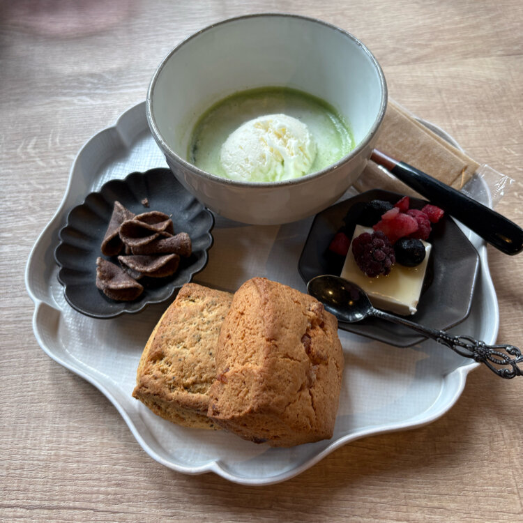 スコーンはプレーンと紅茶。紅茶のスコーンがおいしかった🫖左横に付いてるのは調べたら京都の宮田製菓本舗のちょこ煎という商品だそう🍫カリッとした食感がおいしい😋