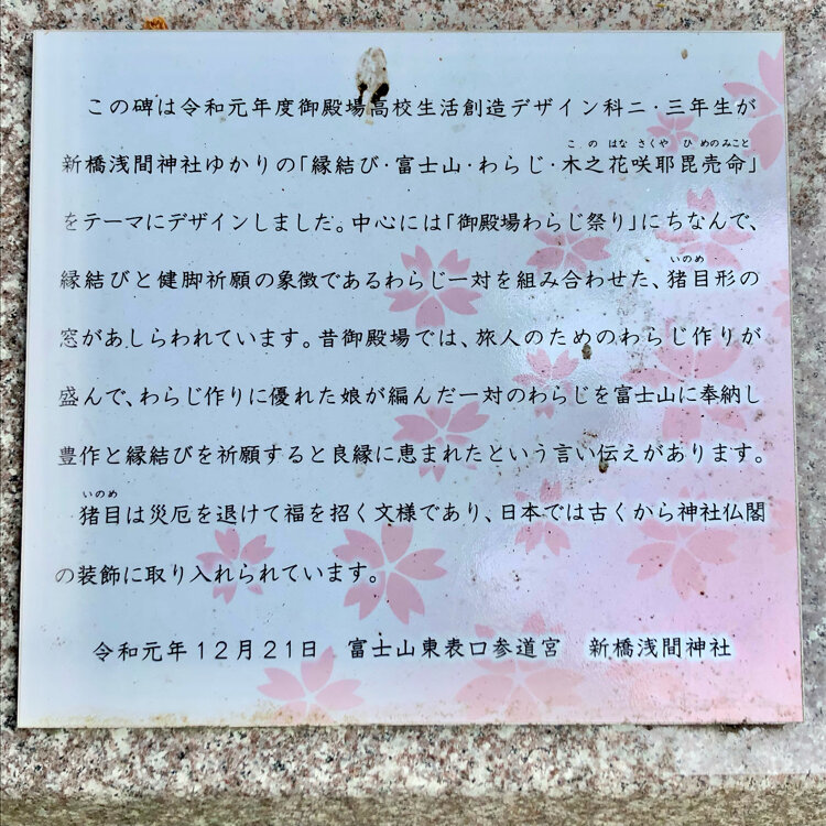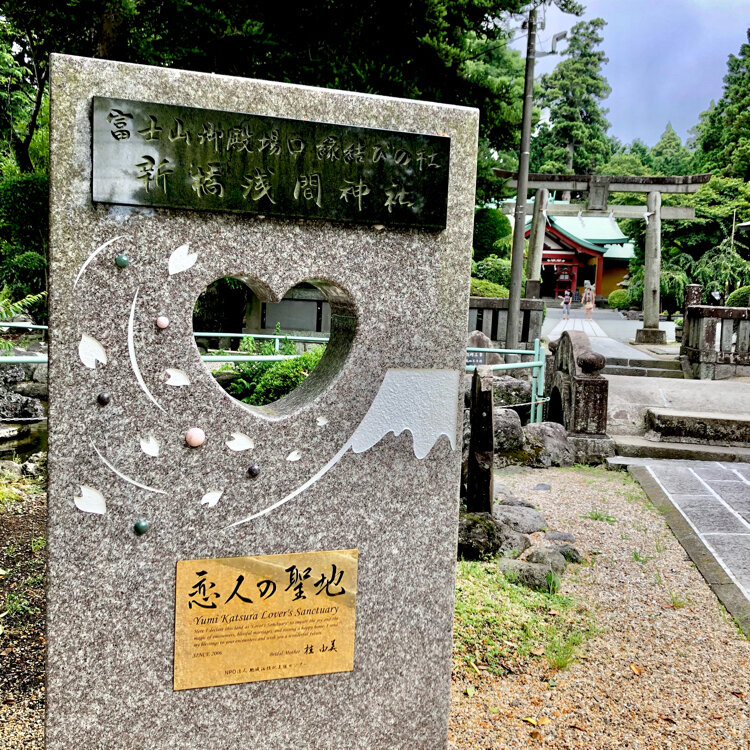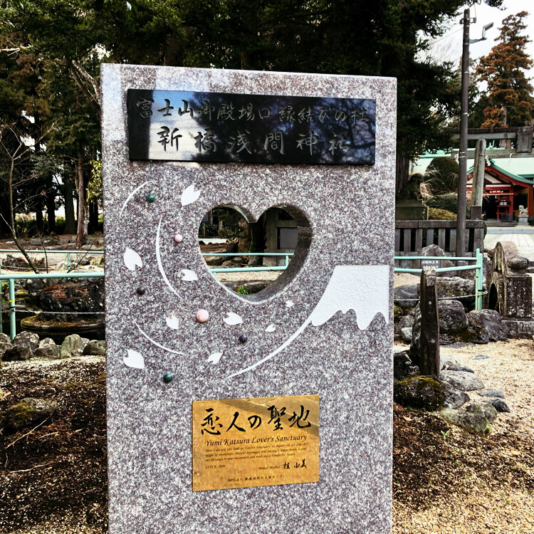 富士山東表口参道宮として毎年7月1日には富士山御殿場口開山式が行われる神社です。木之花咲耶毘売命(このはなさくやひめのみこと)を主祭神とし、境内には富士山の伏流水『木の花名水』が湧いています。2019年には縁結びのパワースポット『恋人の聖地』に選定され市内のホットスポットになっています。地元高校生がデザインした猪目形(ハート形)の窓があしらわれた記念碑も必見です。