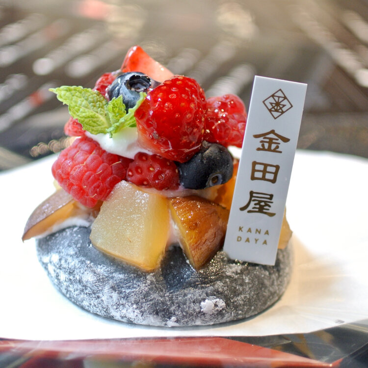 下は大福とフルーツ(竹炭を練りこんだ羽二重もち米100%のふわふわ大福)