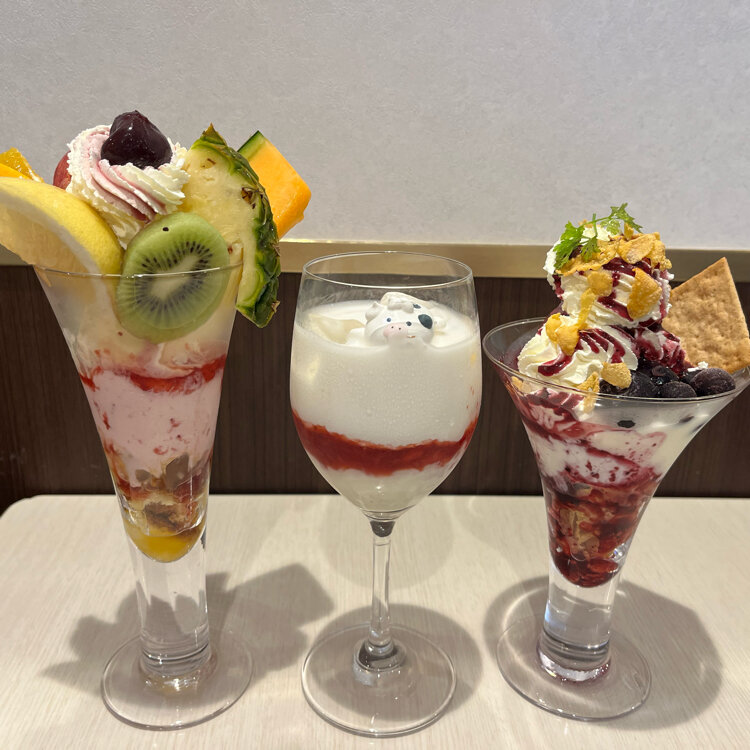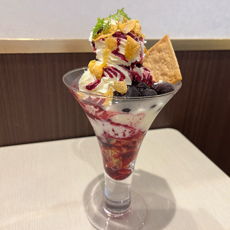 たくさんの種類がある中、私はフルーツパフェ、先輩はスノーロイヤルブルーベリーパフェを注文。