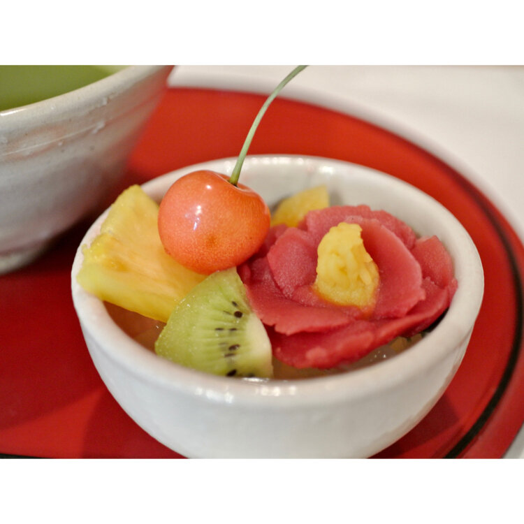 📷②みつ豆には真っ赤な椿のお花🌺✨️