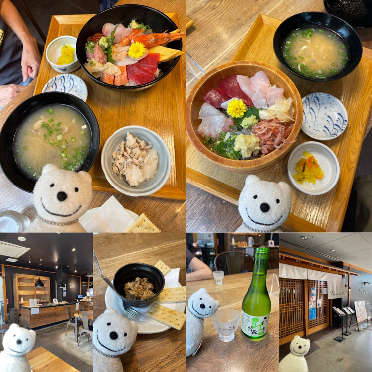 クマ散歩:沼津かねはちで品行方正なクマは特選海鮮丼、駿河丼、オイルサバディン&花の舞冷酒の千本港町の昼下り The Bear had a drink with Special Assorted Seafood Rice Bowl, Assorted Suruga Bay Seafood Rice Bowl, Oil SABAdine & Hana no mai Cold Sake early in the afternoon at Numazu Kanehachi, Senbon Minatocho!♪☆(*^o^*)