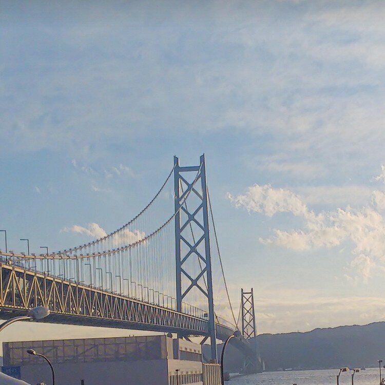 明石海峡大橋の夕暮れ時はとても綺麗!対岸の淡路島も見えます。橋はどこから撮っても綺麗だけど、日常的に電車の駅で降りた瞬間に撮る一枚は、本当に日常の中に溶け込んだ景色です。