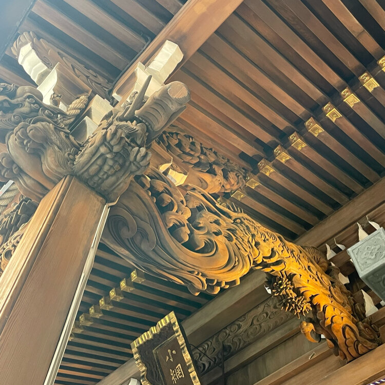 拝殿からせり出した向拝には、「昇り龍」と「降り龍」の2つの龍の彫刻が施されています。天に昇る姿と降りる姿が一対になっており、神社の御利益にちなんで強運厄除の御神体として崇められています。