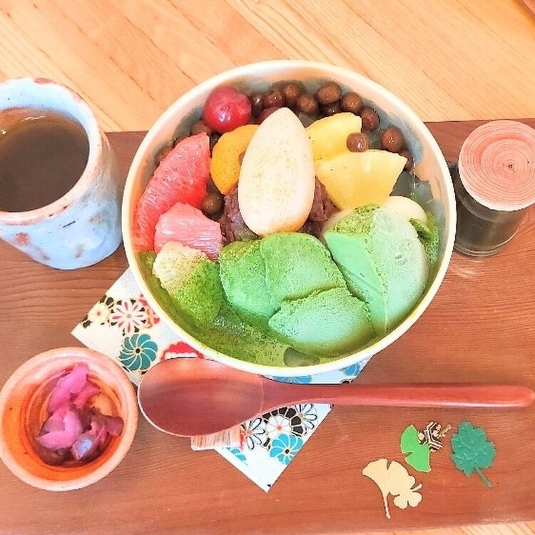 抹茶アイスは甘みが少なく抹茶の苦味が美味しい。手作りされている、優しい甘さのあんこにゴロゴロと大きめの寒天に白玉。フルーツもたくさん。