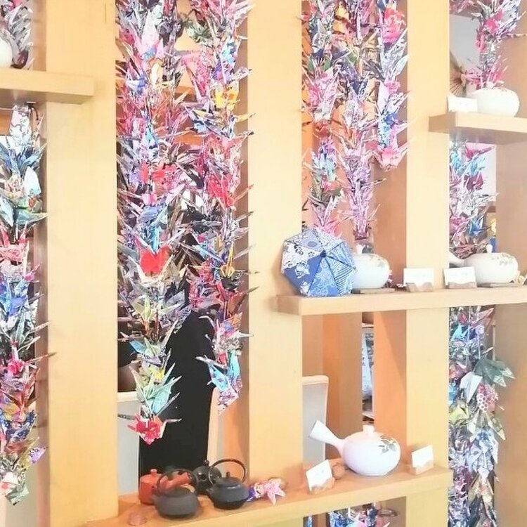 店内には色鮮やかな沢山の折り鶴が吊るされています。