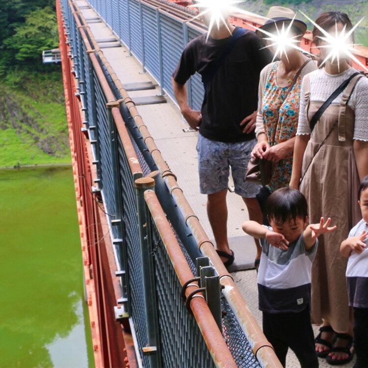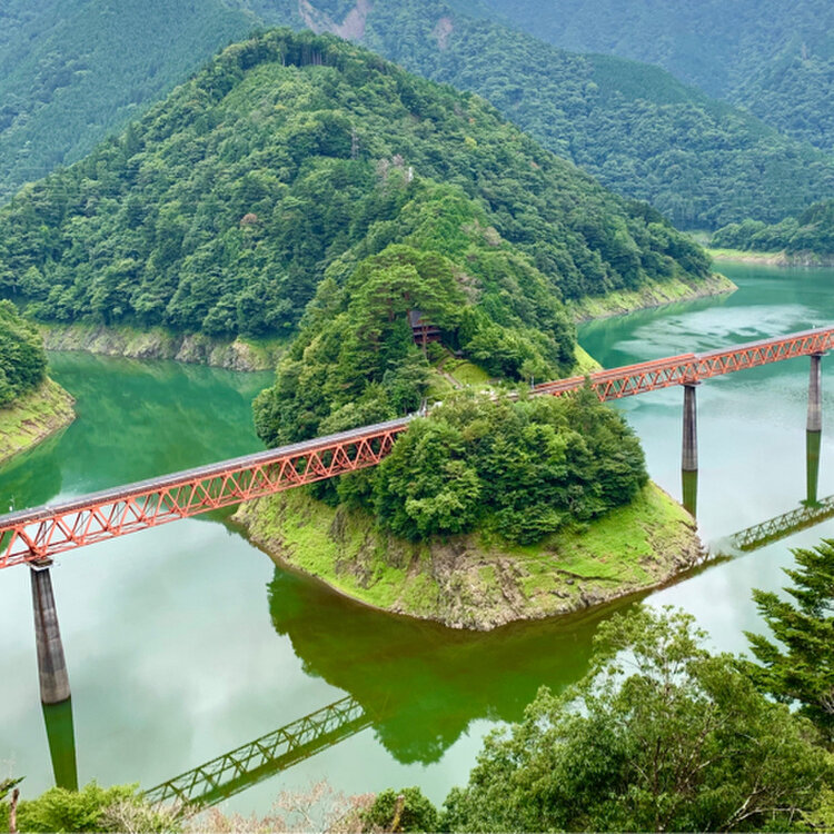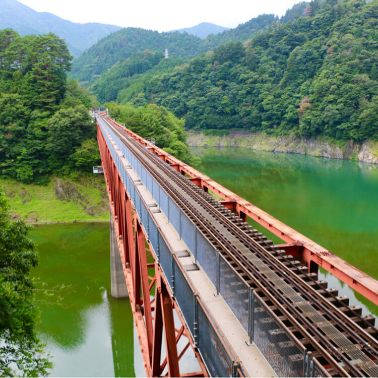 南アルプスあぷとライン(井川線)で、ダム湖に浮かぶ奥大井湖上駅にかかる鉄橋「奥大井レインボーブリッジ」を渡りました。エメラルドグリーンの湖面と真っ赤な鉄橋がとても綺麗でした。