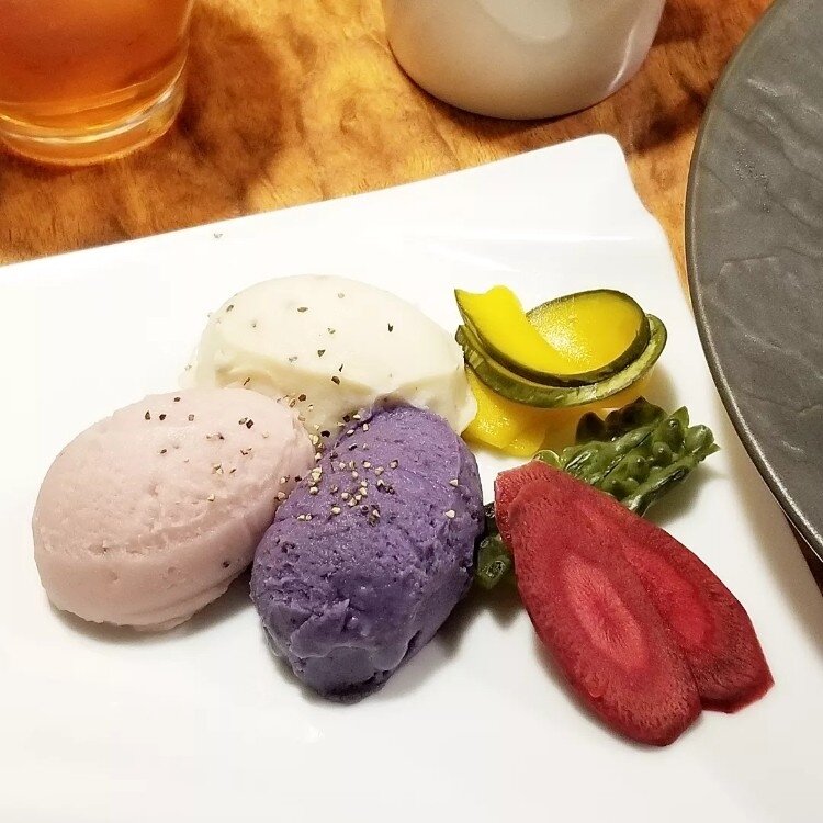 ランチにカラフルなポテトサラダとピクルスをセットにできる