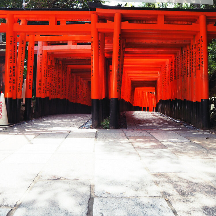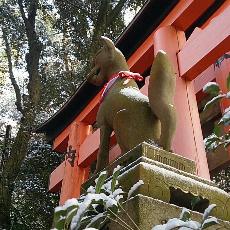 念願の雪の京都! 伏見稲荷大社のお稲荷さんも雪をかぶってました。 前日に降り積もった雪で当日はぱらつく程度。傘要らずで雪景色を楽しめてラッキーでした。