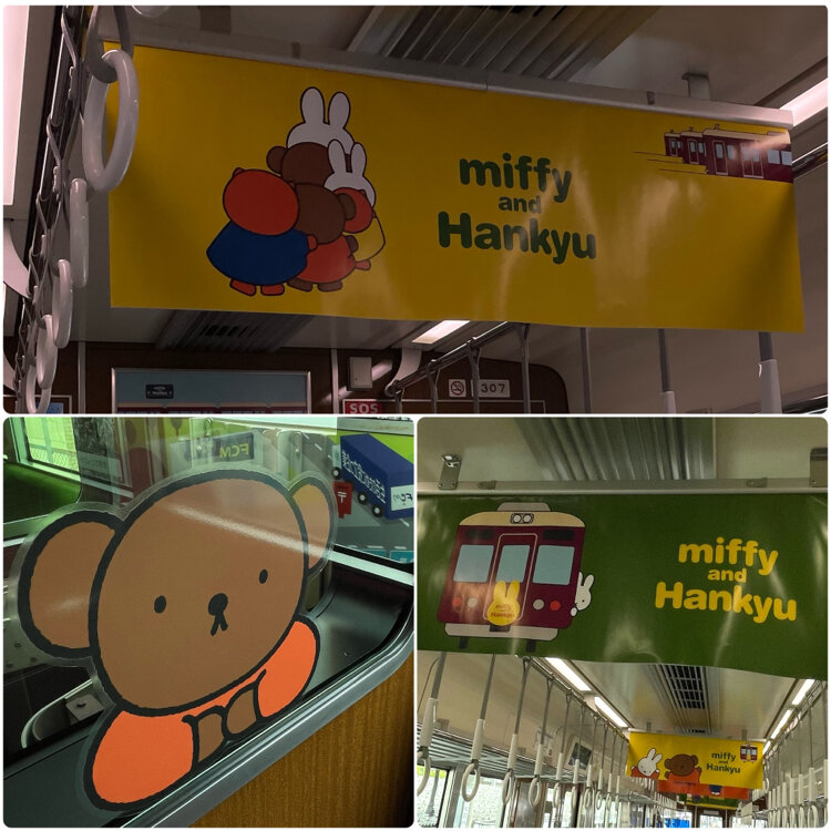 先月からミッフィーとなかまたちが阪急沿線をめぐる様子を装飾した列車が、 神戸線・宝塚線・京都線で1編成ずつ運行されています。