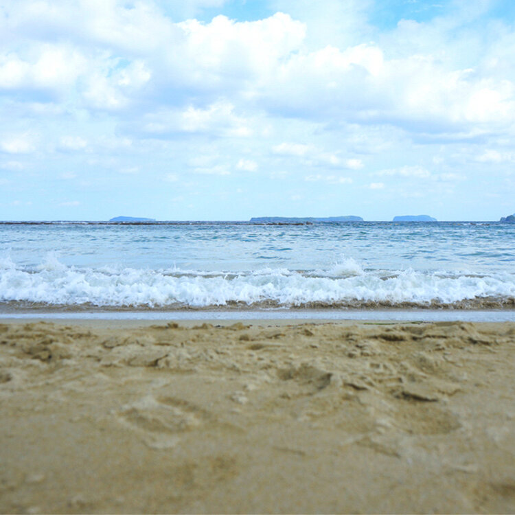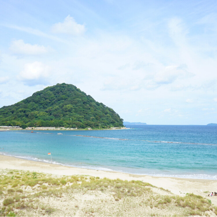 山口県萩市の景勝地 菊ヶ浜は萩城跡から緩やかにカーブを描きながら続く浜辺で、海の美しさもさることながら、そこから見える島々や萩城のあった指月山のある風景も美しい場所です。