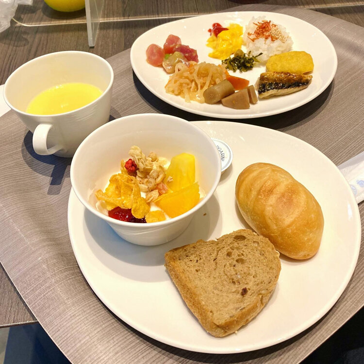 日和ホテル銀座でホカンス 朝食ビュッフェ+全員にサラダプレートのサービス、屋上に露天風呂、お風呂上がりのアイス、寝る前のお茶漬け、部屋が琉球畳のため裸足で過ごせるなど楽しいこといっぱいのホテルでした😆