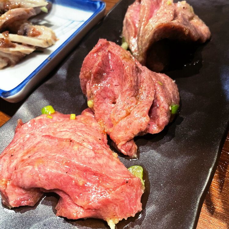 ①めちゃくちゃ分厚い特上ワイルド牛タン!ハサミで切って食べました。
