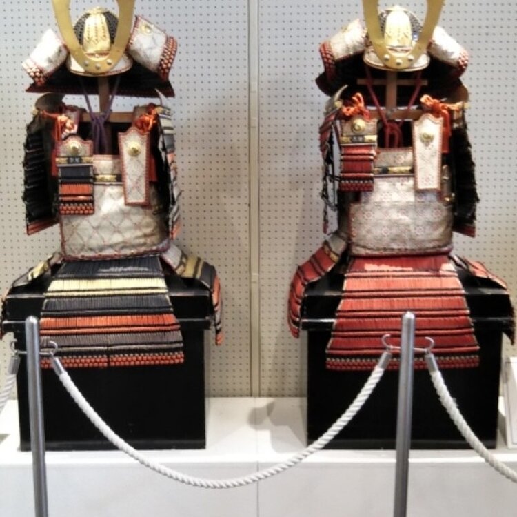 ㊨ 赤糸縅大鎧(あかいとおどしおおよろい)新田義貞役の根津甚八さんが着用したもの