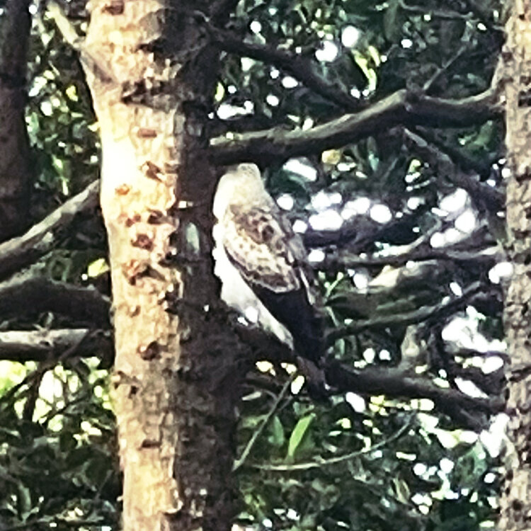 そのおかげか、カヌーを漕ぎ海に戻る間にカンムリワシの幼鳥を見ることができました。カヌーを漕ぎながら、しかも防水ホルダー越しなので不鮮明で頭の部分は木に隠れてしまったのでわかりにくいですが、真っ白で綺麗な鳥でした。