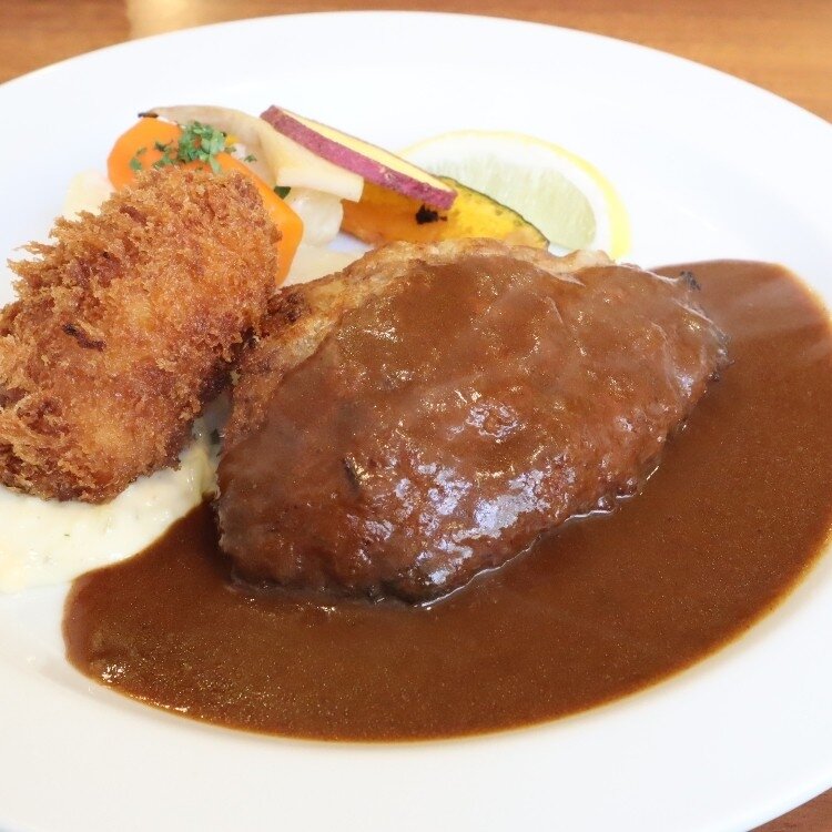 ハンバーグは、周りにパン粉?をつけて焼いているのかな?今まで食べたハンバーグとはちょっと違う感じがしました✨